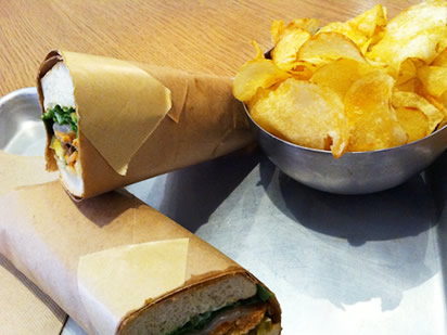 (Above: Hubbub sandwich served wrapped in butcher paper, with a side of chips in a tin bowl on a tin tray.)