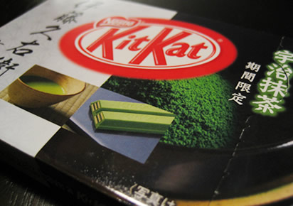 Konbiniya is a quaint little store on Robson. It’s a mish mash of Japanese groceries, video rental and Internet cafe that caters to overseas Japanese students and the occasional brave tourist. I like to drag Tre here once in awhile to pick up some yummy snacks. They have a huge variety of interesting chips, cookies and frozen treats. I had come here in hopes of finding a certain kind of Glico Pretz that a friend had brought us from Shanghai. They were so good that Tre and I have been looking for them ever since — but nope — not here. We ended up grabbing something else and was paying for it when we noticed the Green Tea Kit Kat at the counter.